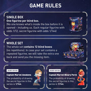 • [POP MART] Marvel Infinity Saga series figures: The blind box will randomly contain figures from a specific series. Each blind box only contains one figure. No one knows what's inside, including us. This collection includes 12 blind box figures. One of them might be a secret edition.